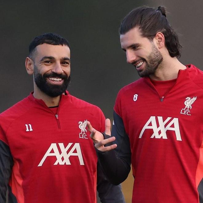 在对阵国米之前,利物浦在训练中心进行了备战训练,萨拉赫参加了训练,和队友埃基蒂克等人聊天,笑容满面。